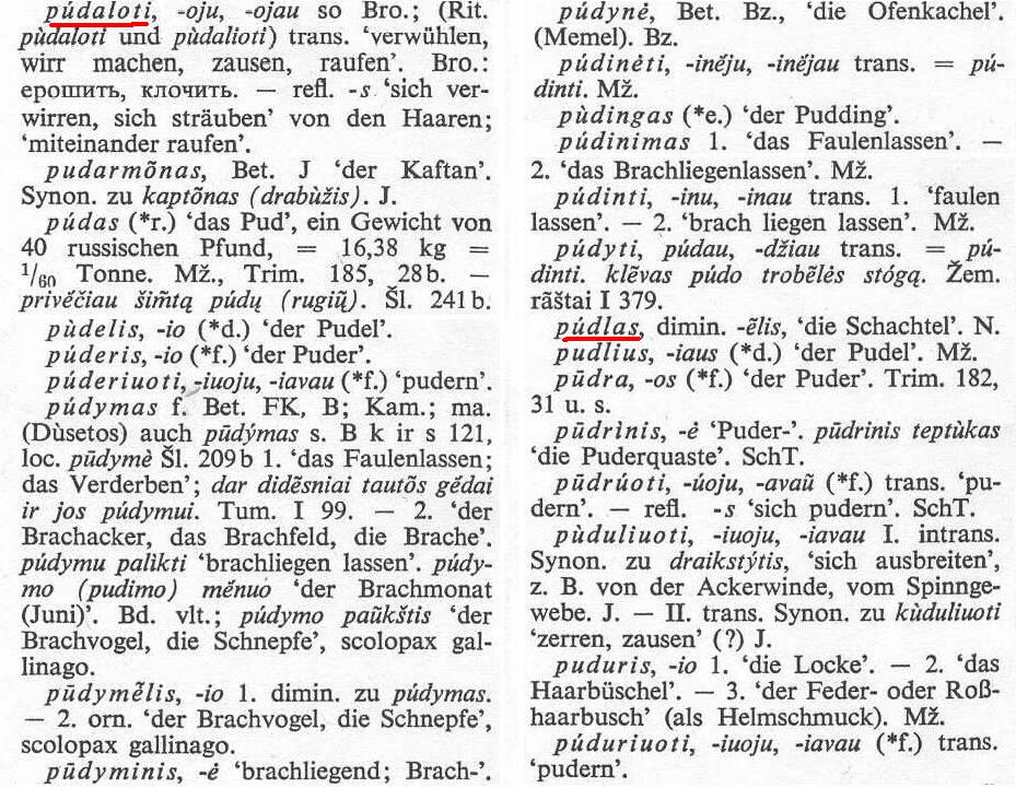 herleiten. Das schien im jugendlichen Alter sicher zu meinem Äußeren gepasst zu haben. Meine Mitschüler mussten nicht lange nach einem Spitznamen für mich suchen: “Pudel”. pudelis bedeutet übrigens auch im Litauischen “Pudel”, wie man aus der nebenstehenden Seite mit “pud” aus dem Litausch-Deutschen Wörterbuch von Alexander Kurschat (Vandenhoeck & Rupprecht, 1972, Band III, S. 2026) entnehmen kann, die auch die möglichen Erklärungen des Namens als Schachtelmacher bzw. Wuschelkopf bezeugt. Um diese Seite vergrößert anzusehen, genügt ein Klick auf die obige Grafik.